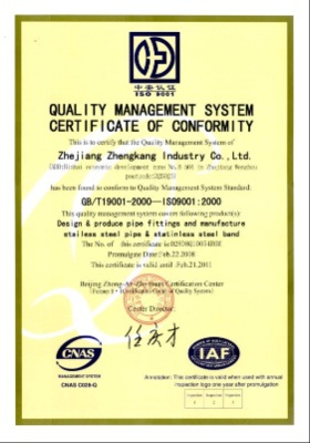 ![]() | ISO9001 | BeiJing Zhong-An-Zhi-Huan Certification Center | Design& produce pipe fittings and manufacture stainless steel pipe & stainless steel band | 2008-12-22 ~ 2011-12-21 |